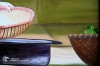 - Ở bức tranh chân dung này, hình ảnh người con gái Việt Nam hiện lên mang đậm nét truyền thống đằm thắm, mặn mà với đôi lông mày lá liễu đen, đôi môi đỏ chúm chím làm nổi bật nước da trắng, đôi gò má hồng hào, mịn màng ngồi bên chiếc chum nước rửa rau,vo gạo. Người con gái ấy mặc trên mình bộ quần áo mang nét đặc trưng của trang phục Việt xưa với hình ảnh chiếc yếm lụa đào mềm óng tựa như vẻ đẹp của người con gái mới lớn cùng với cái váy đụp đen quen thuộc.
