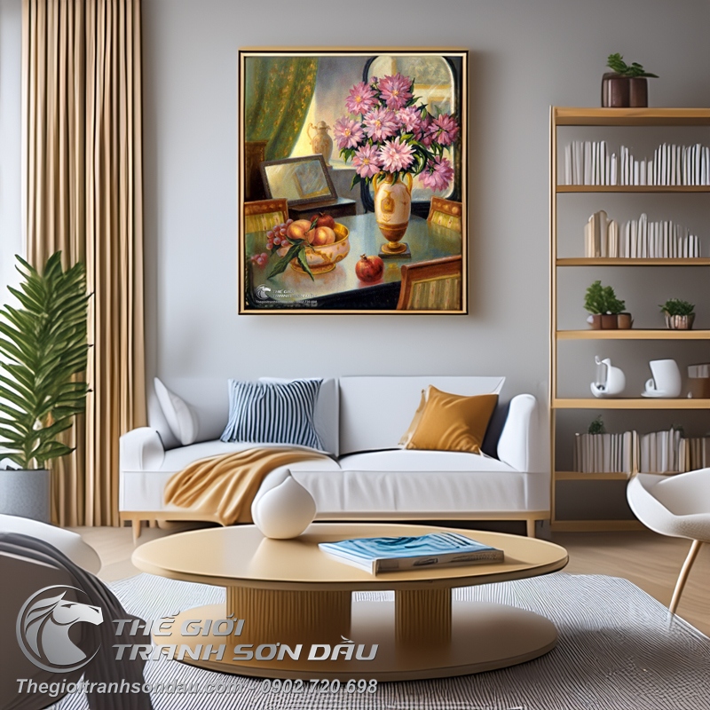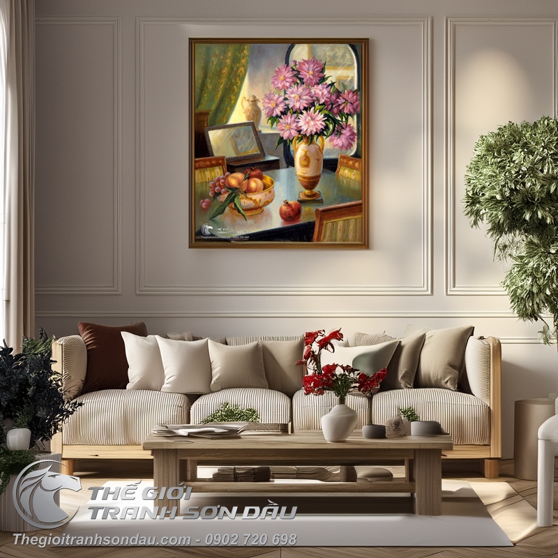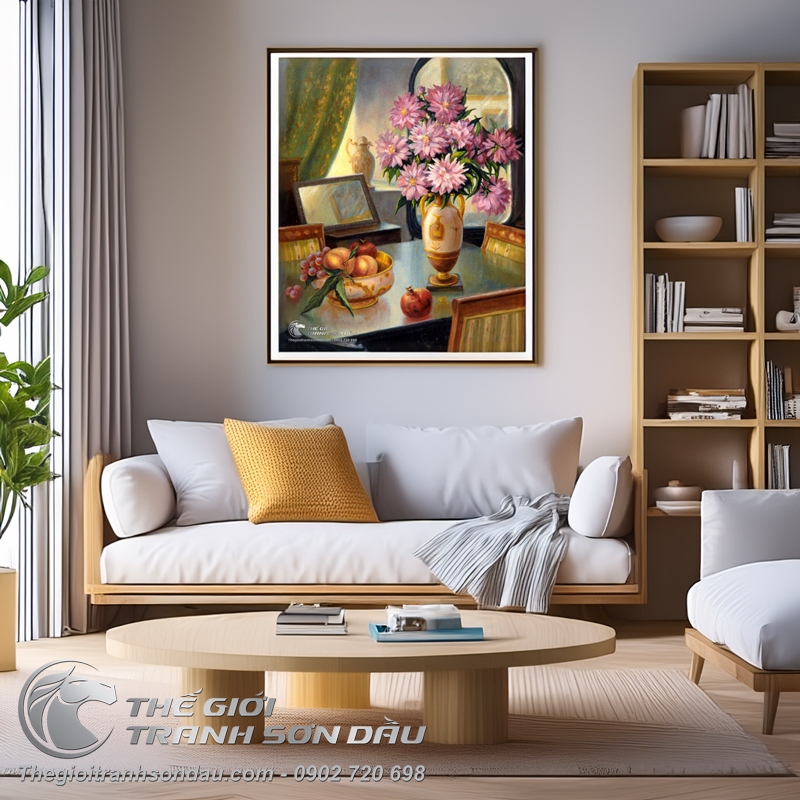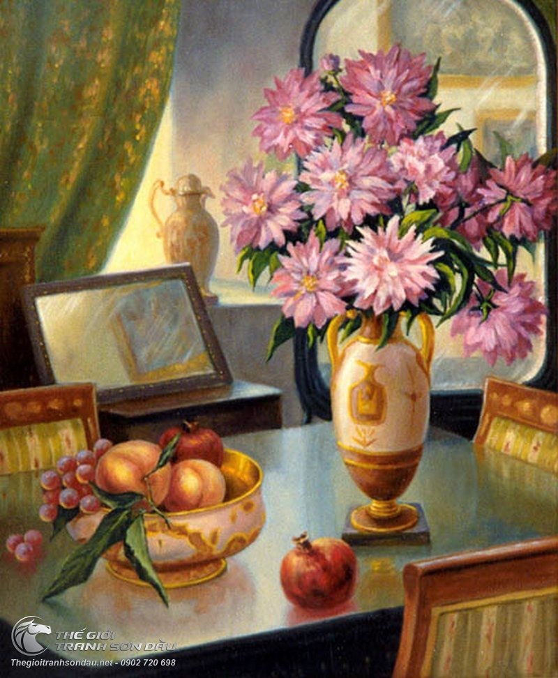 Tranh Tĩnh Vật Hoa Cúc Bên Giỏ Trái Cây