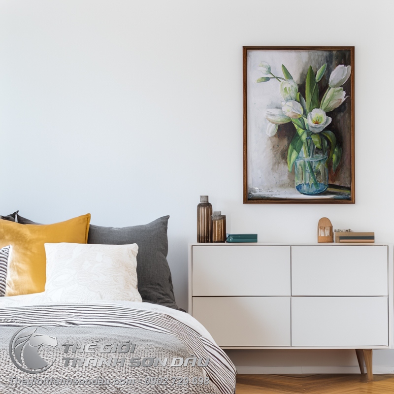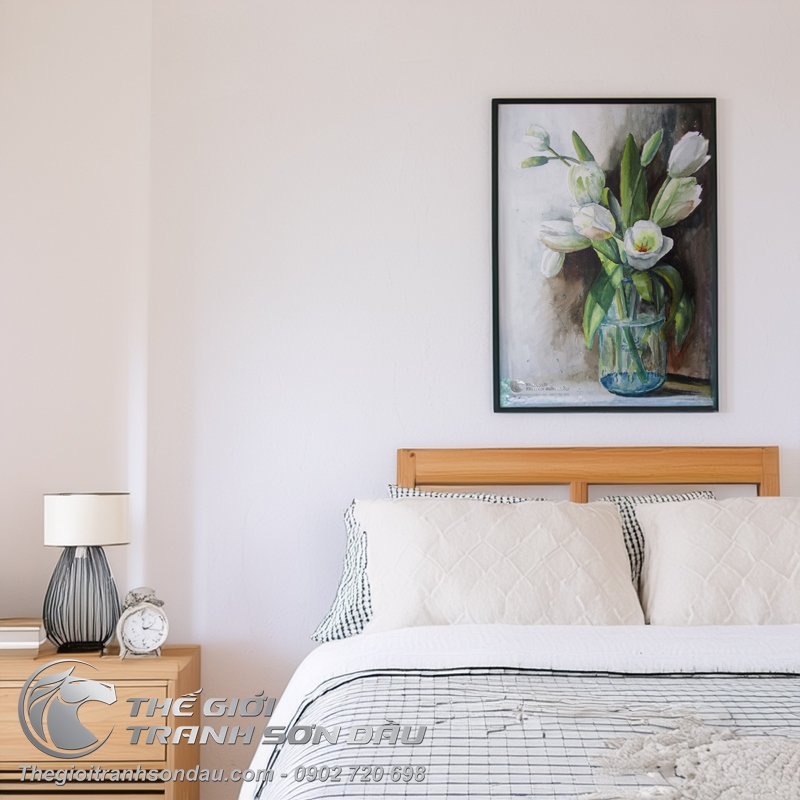 Tranh Vẽ Bằng Sơn Dầu Bình Hoa Tulip Trắng Tinh Khôi