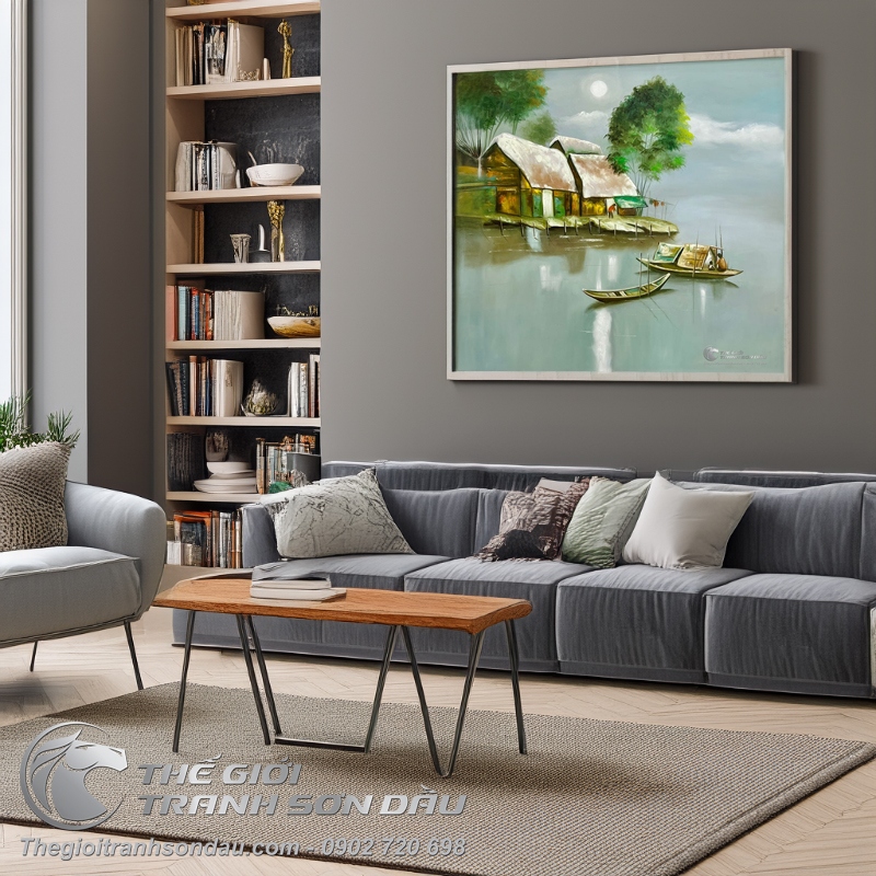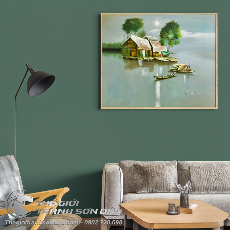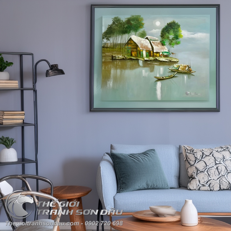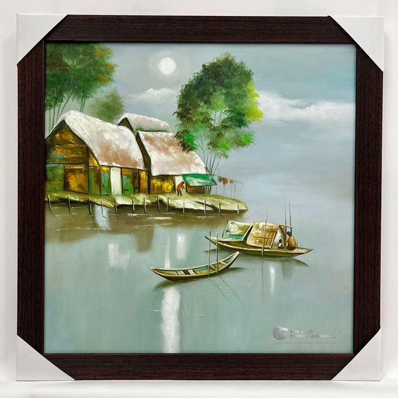 - Tranh vẽ cảnh làng quê con đò bến vắng khắc họa khung cảnh chốn thôn quê bình yên với con đò nhỏ neo đậu nơi bến quê. Giữa những mái nhà tranh nghèo với những bóng sương mờ trải dài nơi bến vắng. Tất cả được sắp đặt khéo léo vào trong một khung hình để tạo nên những hiệu ứng độc đáo & chiều sâu cho bức tranh.