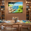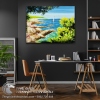 - Tranh vẽ phong cảnh châu Âu lấy màu xanh của biển cả, mây trời làm điểm nhấn, với những gam màu đặc trưng quen thuộc với người xem. Những vách đá cheo leo sóng vỗ, những bụi cây dại ven bờ khắc họa một không gian buổi sáng bình minh dịu dàng, tự nhiên và thanh khiết.