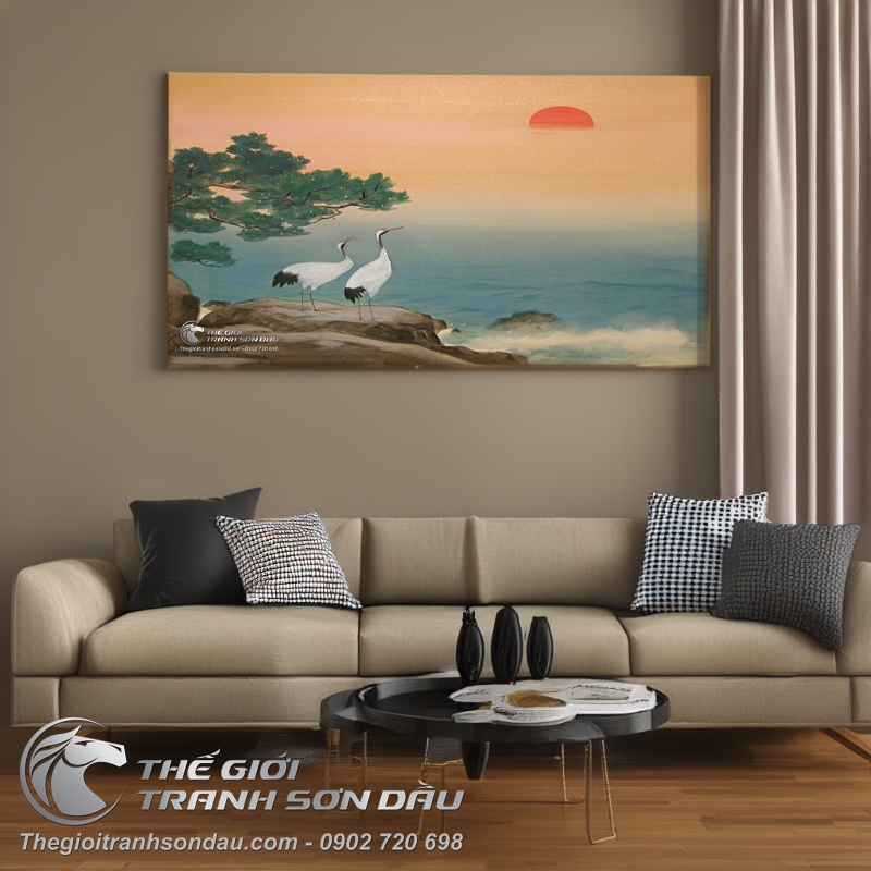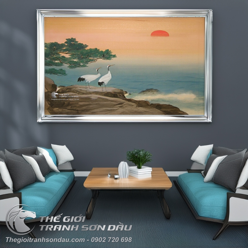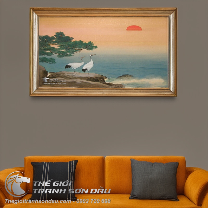 Tranh Vẽ Đôi Chim Hạc Đang Ngắm Hoàng Hôn