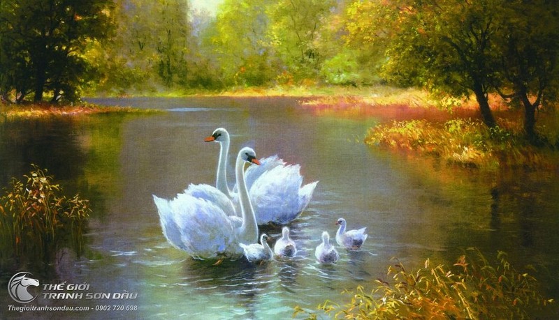 Tranh Vẽ Gia Đình Thiên Nga Tuyệt Đẹp Bằng Sơn Dầu Cao Cấp