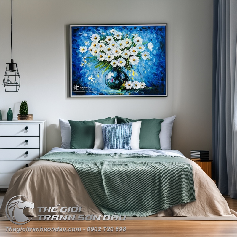 Tranh Vẽ Sơn Dầu Bình Hoa Cúc Trắng Nghệ Thuật