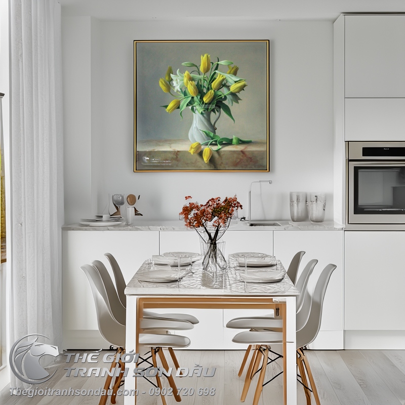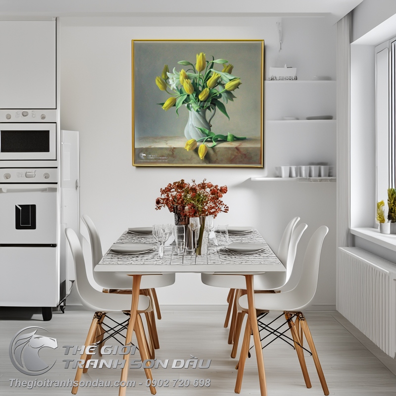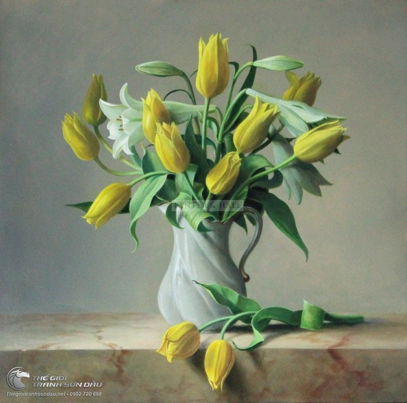 Tranh Vẽ Lọ Hoa Tulip Vàng Và Hoa Loa Kèn Trắng