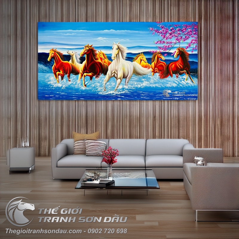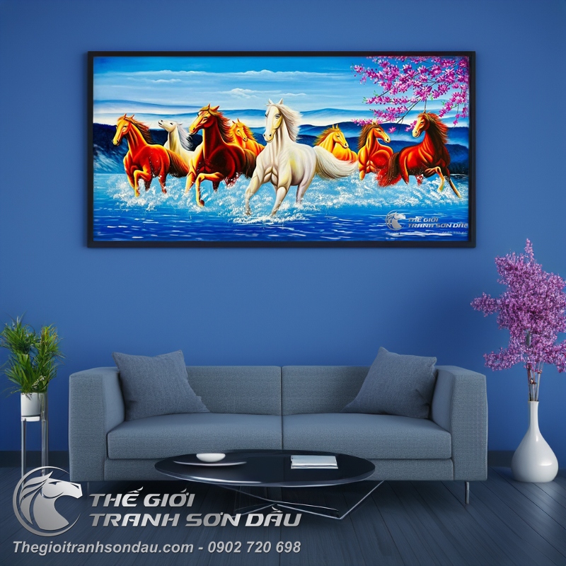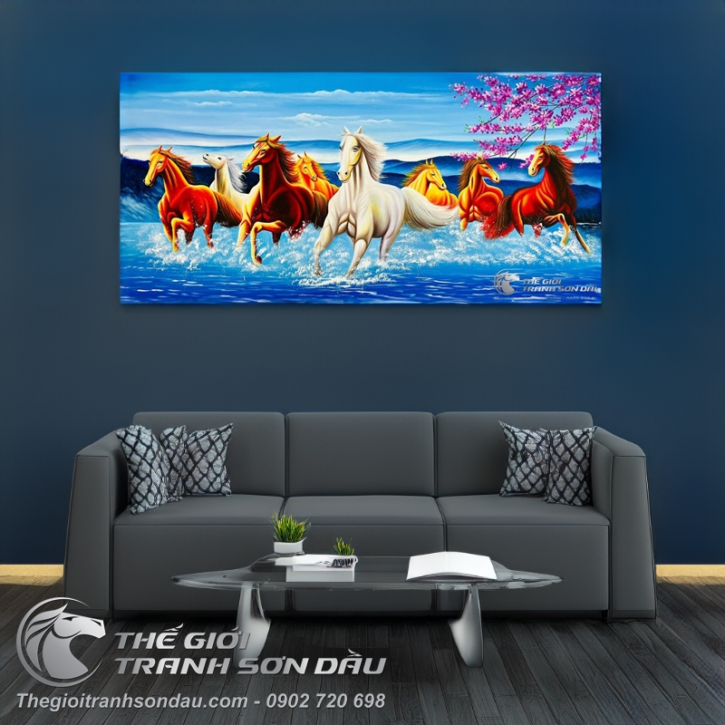 - Tranh vẽ mã đáo thành công rực rỡ là sự kết hợp giữa hình ảnh đàn ngựa 8 con đạp gió băng ngàn hướng tới phía trước & hình ảnh những cánh hoa đào mùa xuân. Mang tới cho không gian sức sống mạnh mẽ, sự tươi mới sắc xuân ngập tràn trong không gian. Có tác dụng trang trí và ý nghĩa phong thủy rất tích cực cho người dùng.