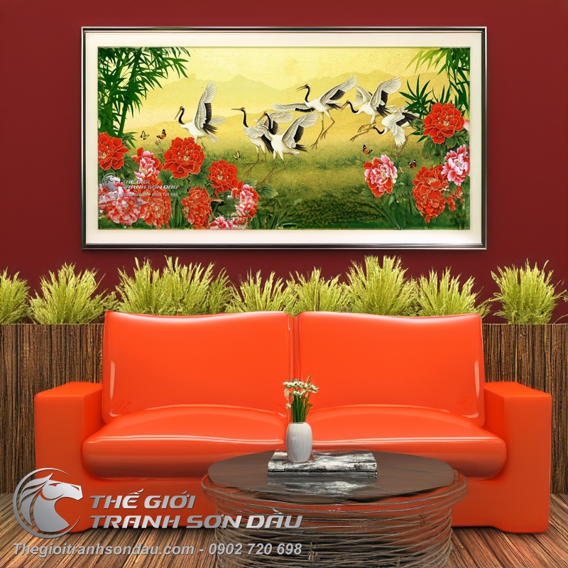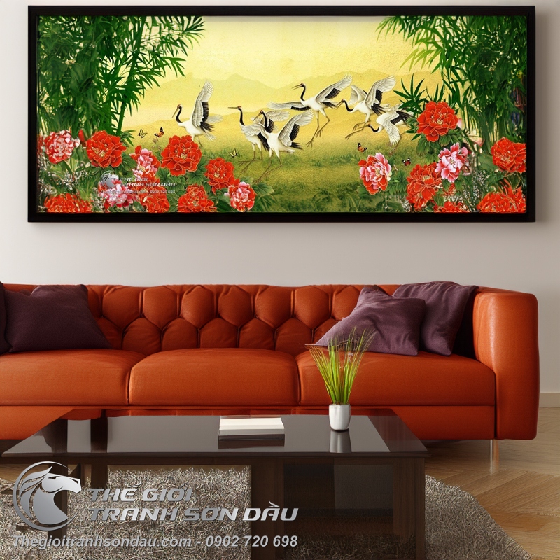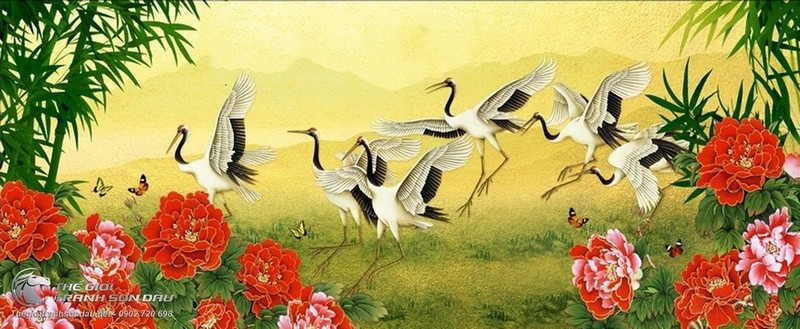 Tranh Vẽ Những Chú Chim Hạc Bên Hoa Mẫu Đơn Và Khóm Trúc