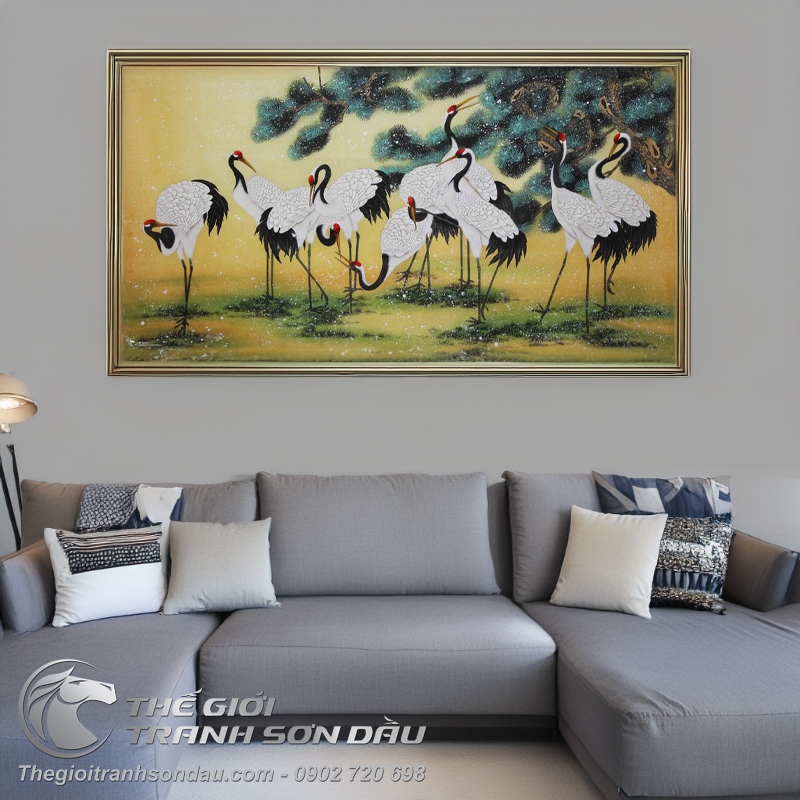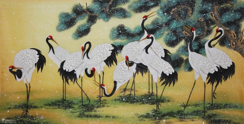 Tranh Vẽ Những Đôi Chim Hạc Đang Kiếm Ăn