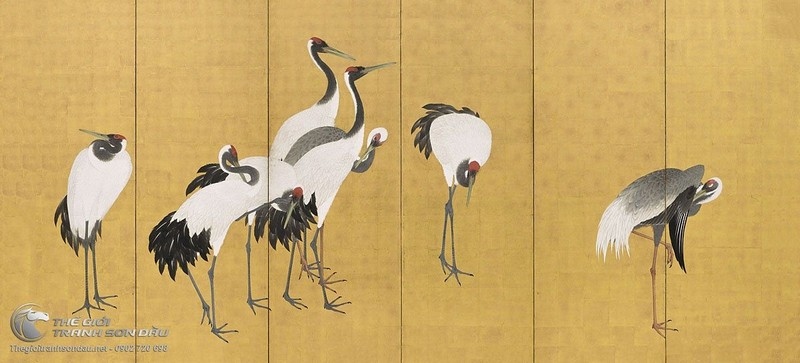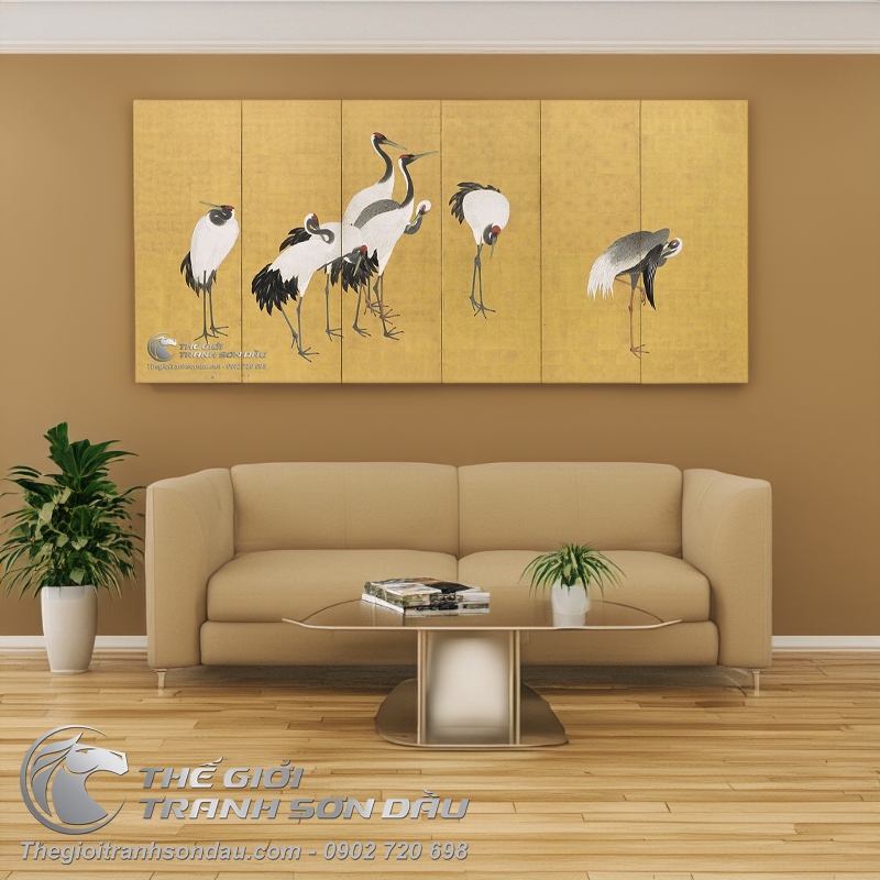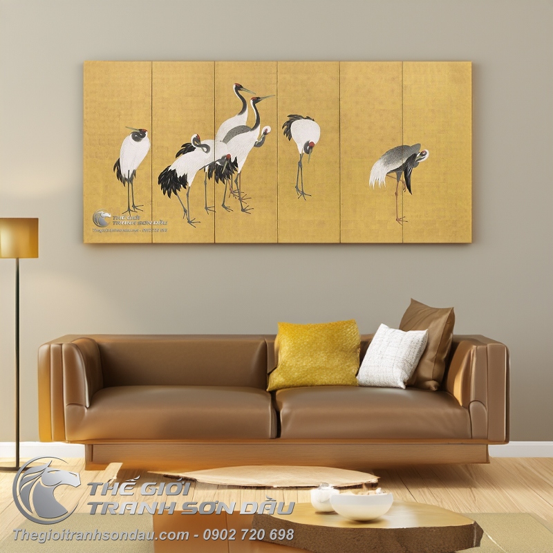 Tranh Vẽ Những Đôi Chim Hạc Trên Nền Màu Vàng Nhạt