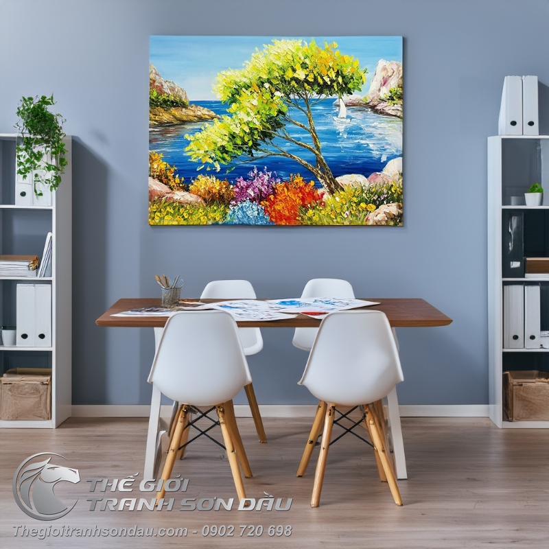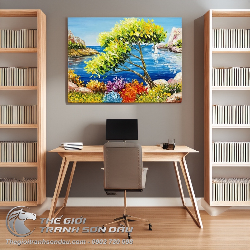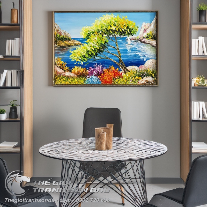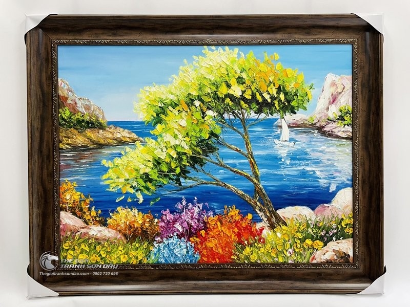 - Bức tranh vẽ sơn dầu biển khơi lấy cảm hứng từ góc biển đón ánh bình minh, nơi những tia sáng đầu tiên trong ngày soi rọi. Những đám mây xanh biếc trong không gợn mây, mặt biển xanh phản chiếu bầu trời. Những chiếc lá nhỏ đung đưa trong gió, ngọn sóng lăn tăn xô bờ, con thuyền nhẹ nhẹ ra khơi. Tạo nên một khung cảnh đầy màu sắc, mang tới sự tươi mới cho không gian trang trí.