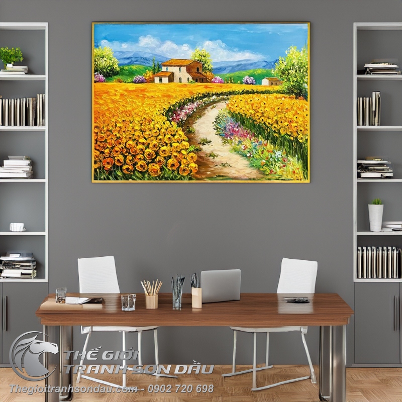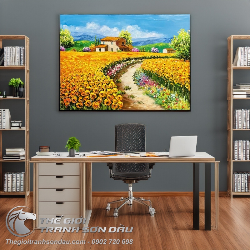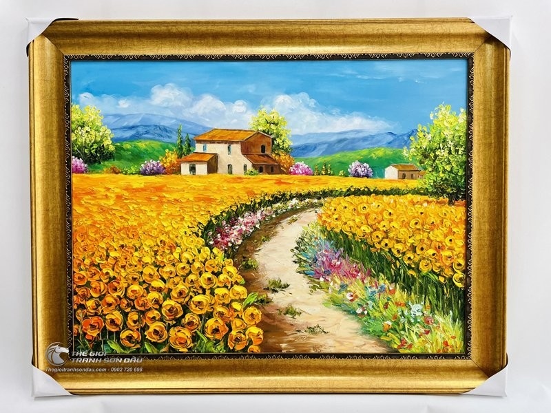 - Tranh sơn dầu nghệ thuật ngôi nhà giữa vườn hoa là sự kết hợp giữa cảnh sắc thiên nhiên tuyệt đẹp và cuộc sống bình dị nơi làng quê châu Âu. Đặc trưng với những mái nhà nhỏ cổ kính, phủ nét rêu phong trên tường gạch. Xa xa là dãy núi cao hùng vĩ với bầu trời bao la mây trắng lững lờ trôi đến tận chân trời. Bên cạnh đó là con đường phủ đầy hoa cỏ ngút ngàn đầy rực rỡ, đầy sắc màu và sức sống khi thu sang.