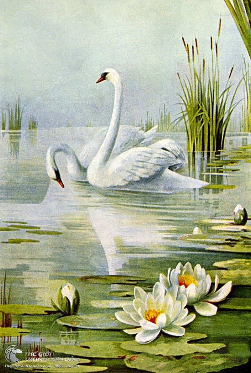 Tranh Vẽ Thiên Nga Và Hoa Sen Trắng Biểu Tượng Phong Thủy