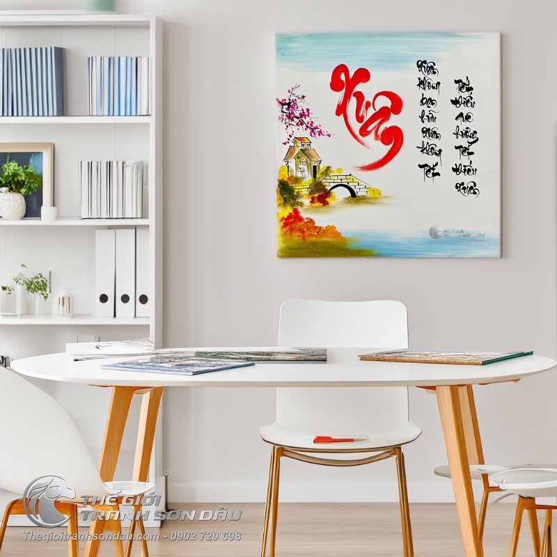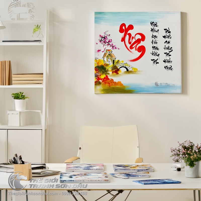- Tranh treo sơn dầu thư pháp chữ Xuân được vẽ theo lối thủy thể, các nét trong một chữ không viết thành hàng ngang mà theo chiều dọc từ trên xuống như thác nước tuôn chảy. Kết hợp với hình ảnh của cảnh vật thiên nhiên như cánh hoa đào khoe sắc thắm, những nhánh cây ngọn cỏ ngập tràn sắc màu tạo nên một không khí mùa xuân tuyệt đẹp, lay động tâm trí người xem.