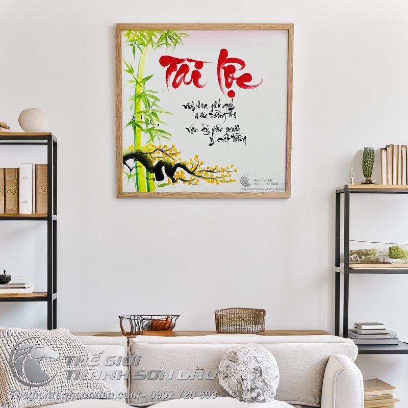 - Tranh sơn dầu treo tường chữ Tài Lộc là sự kết hợp giữa nghệ thuật thư pháp, thi họa để tạo nên sự cuốn hút và nổi bật cho sản phẩm. Với phần nền vẽ cây Trúc, hoa mai vàng không chỉ làm nền cho chữ Tài Lộc thêm đẹp mà còn tượng trưng cho chữ Tín Đức, sự phát triển và thành công mà người kinh doanh luôn hướng tới.